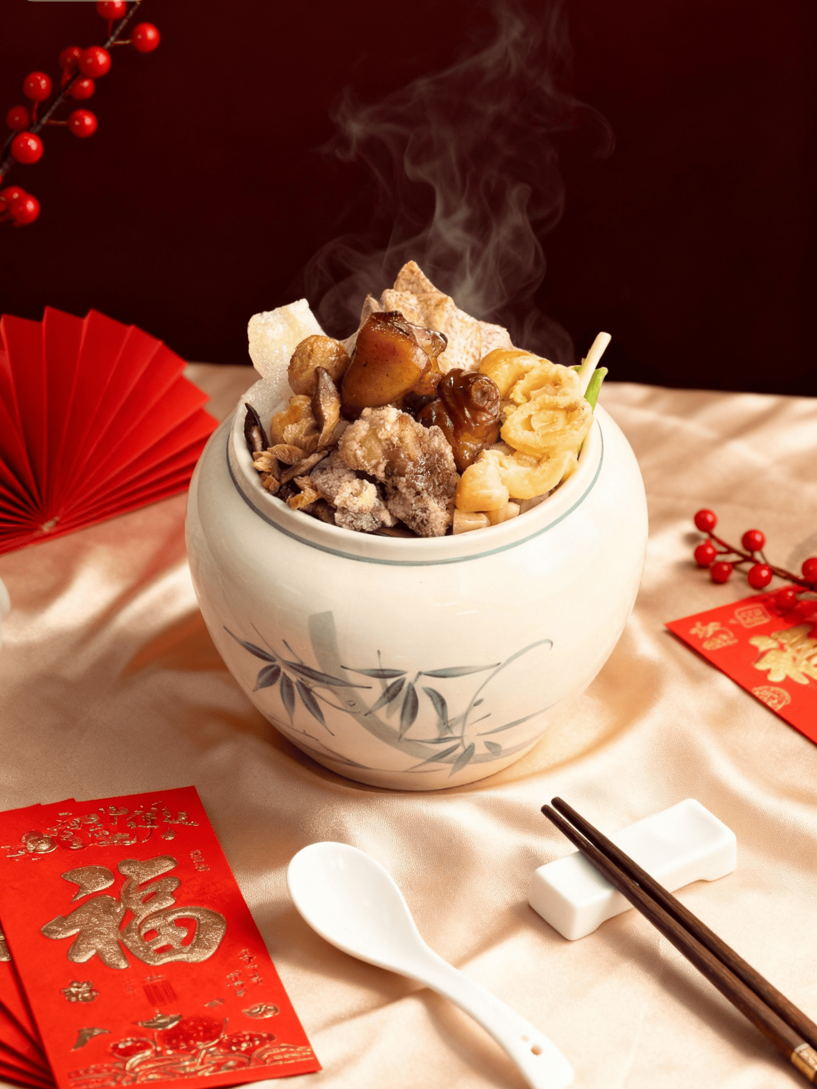 鮑魚、干貝、蹄筋、豬腳與芋頭,慢火細燉;蒜香、香菇、筍絲與栗子交織出層次豐富的香氣,